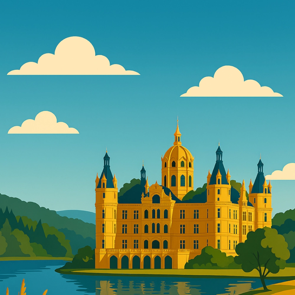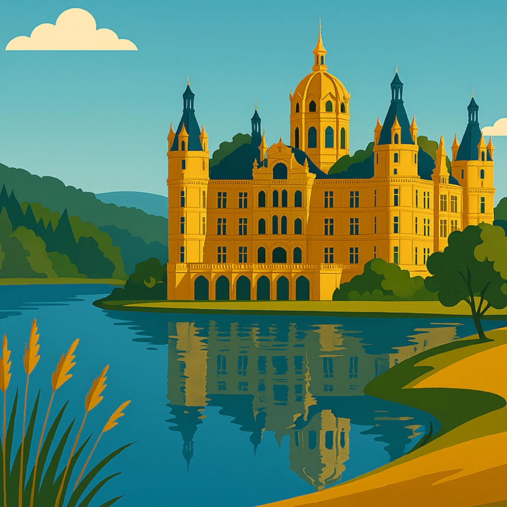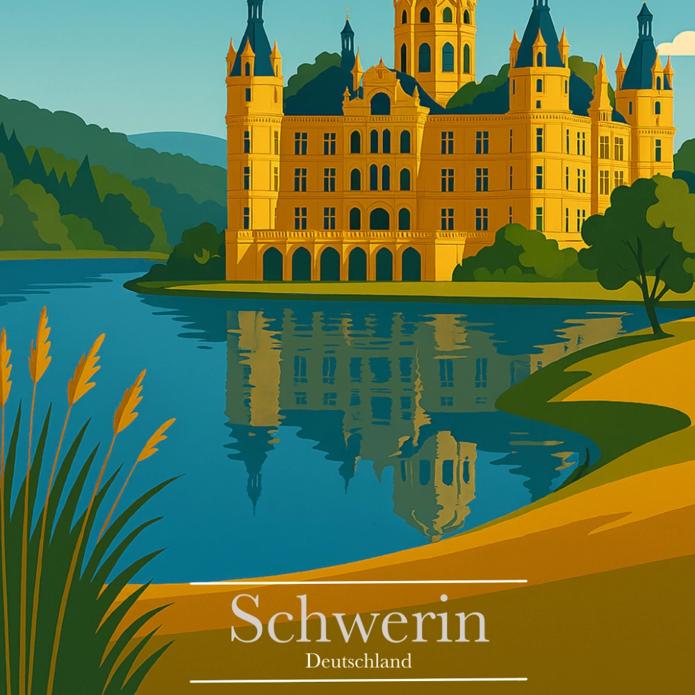 Dieses schöne Schwerin Reiseposter fängt die märchenhafte Eleganz des Schweriner Schlosses in einer stilvollen, zeitlosen Illustration ein. Sanft eingebettet zwischen glitzerndem See und üppigem Grün erhebt sich das Schloss mit seinen goldgelben Fassaden und filigranen Türmen wie aus einer anderen Epoche. Die harmonische Farbpalette und die klare Linienführung verleihen dem Motiv eine ruhige, edle Ausstrahlung, die sofort Fernweh weckt.